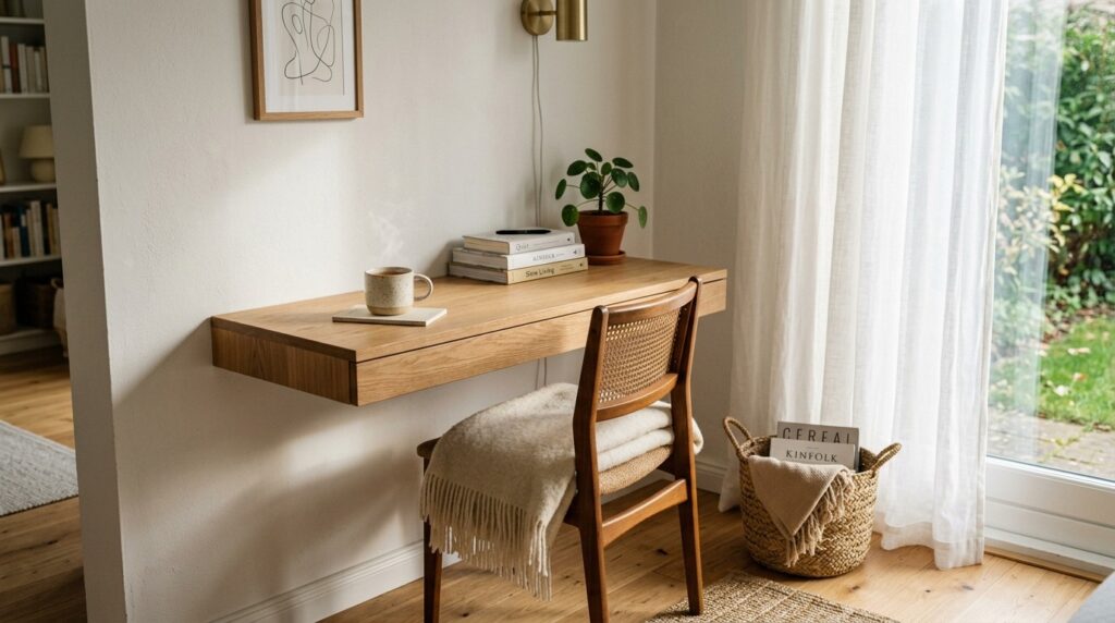 To recreate this look, install a wall-mounted wooden or matte white desk. Keep the area underneath clear or add a small woven basket for subtle storage. Pair with a simple chair and minimal decor to maintain the airy vibe.