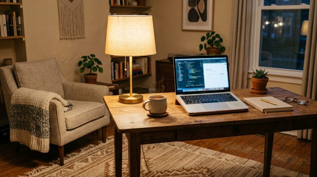 Opt for a small table lamp with a warm bulb. Place it to one side of the desk to create layered lighting. Avoid harsh overhead lighting for a softer, more relaxed atmosphere.