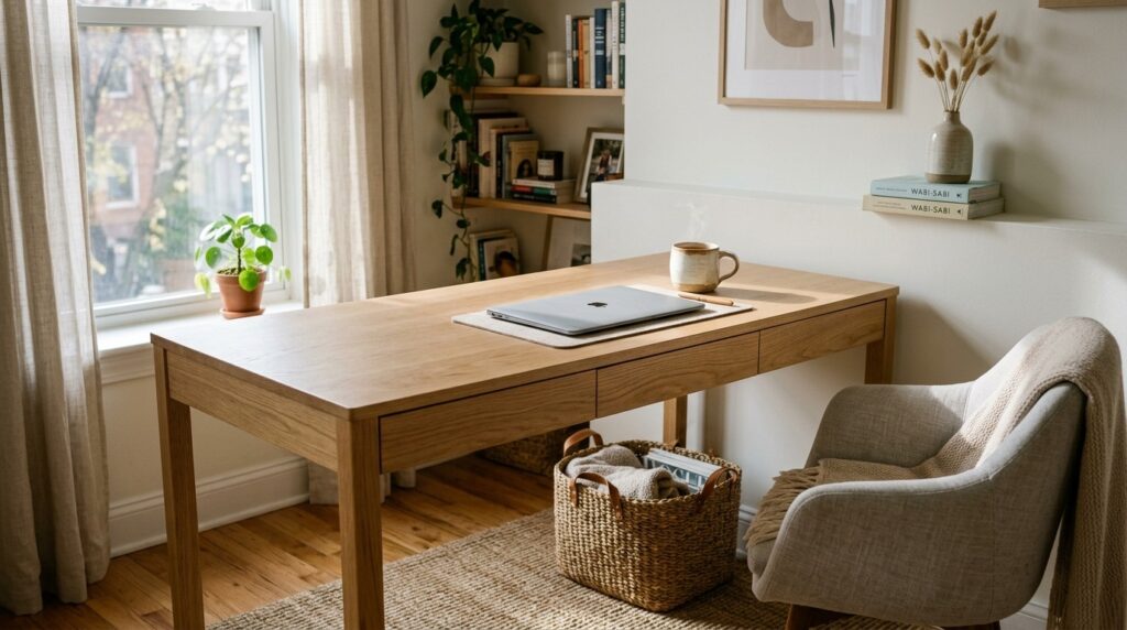 Choose a wooden desk or add wood accents like a tray, shelf, or organizer. Mix light and medium wood tones for a layered, natural feel.