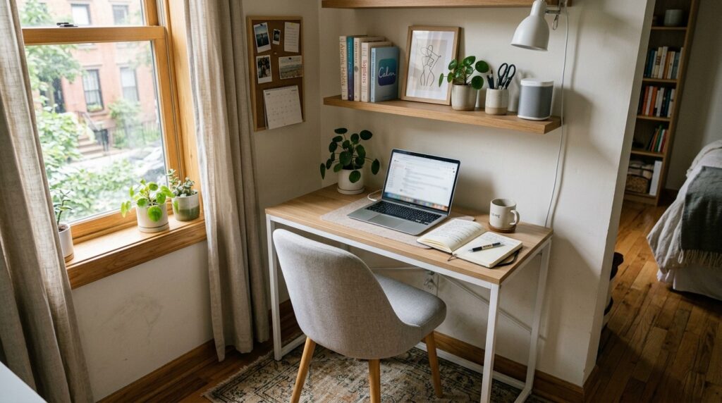 Choose a compact desk and keep only essential items on the surface. Use vertical storage or shelves to maximize space without clutter.