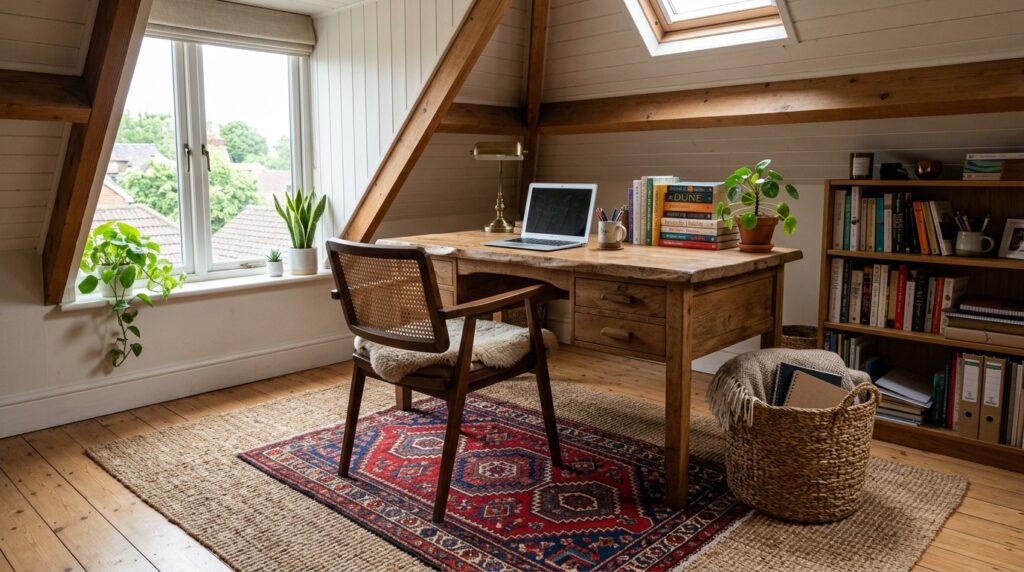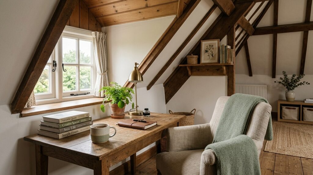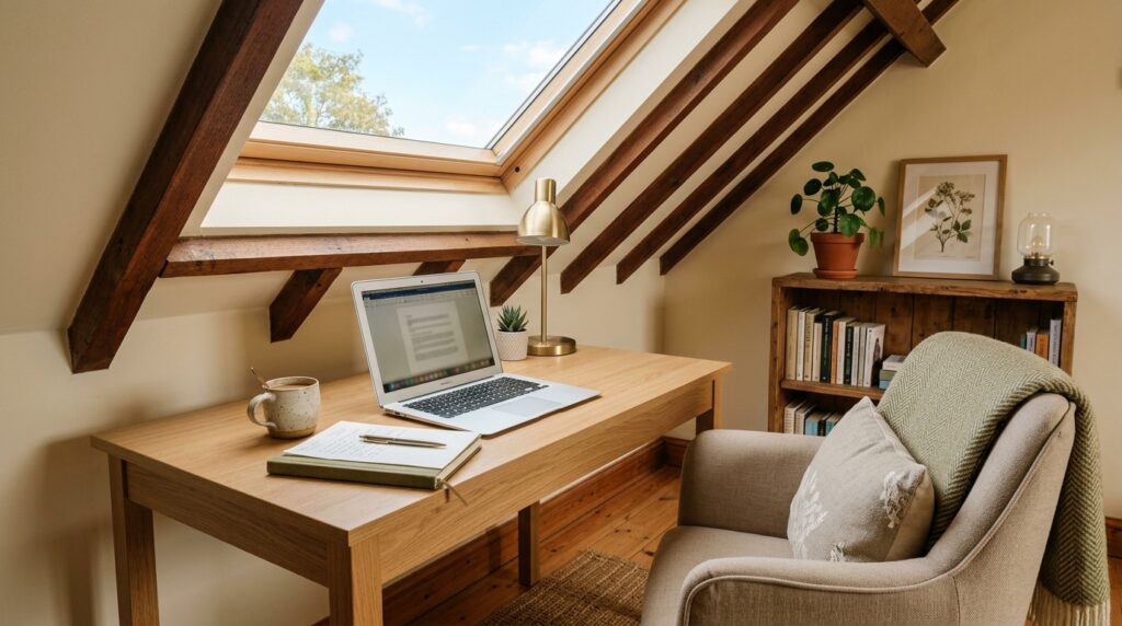 Natural light from a skylight instantly elevates an attic office, making the space feel open and energizing. The gentle daylight creates soft shadows that add depth and warmth without harsh brightness.
