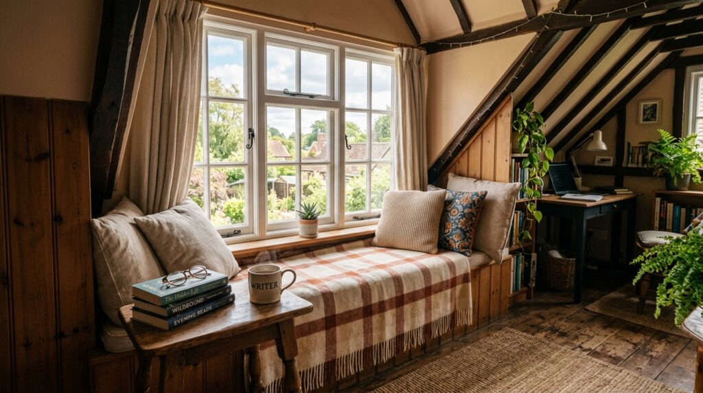 Adding a small seating area makes your attic office feel more like a retreat than just a workspace. A window seat brings comfort and versatility.