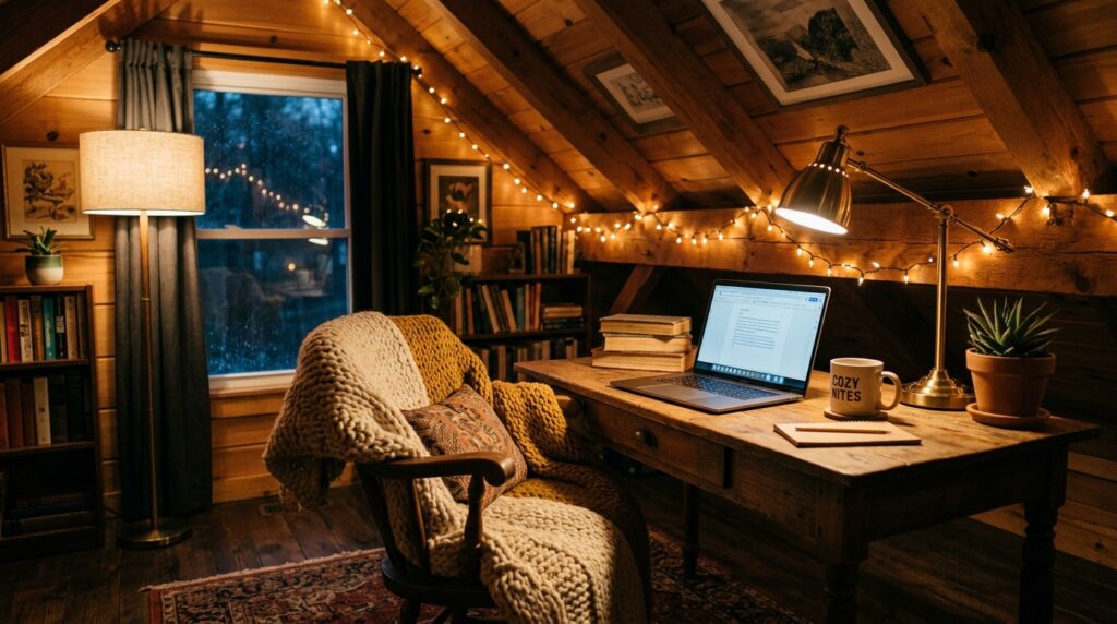 Lighting can completely change the mood of your attic office. Instead of relying on a single overhead light, layering different light sources creates a softer, more inviting environment.