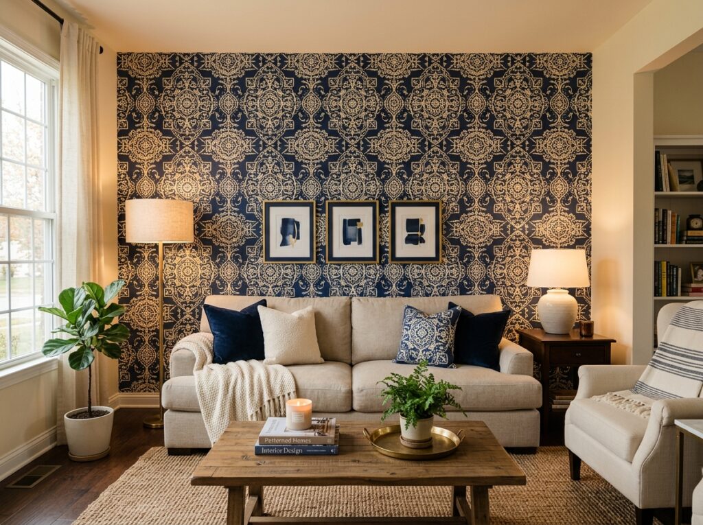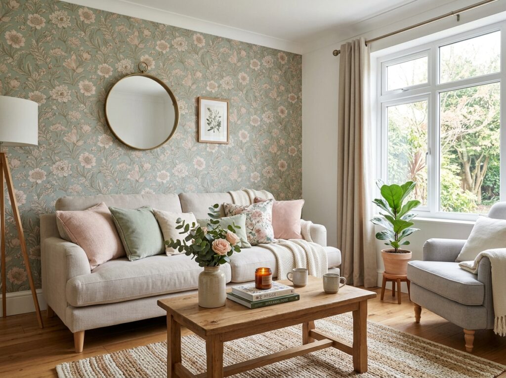 Floral wallpaper adds softness and charm, instantly making the living room feel more personal and inviting. It creates a cozy, almost storybook-like atmosphere when paired with warm textures.