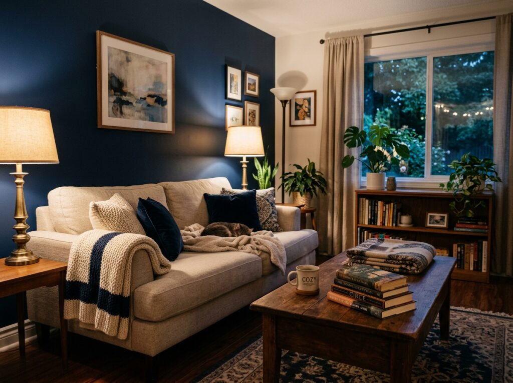 Use matte navy paint to avoid harsh shine, and balance it with lighter elements like a cream sofa or beige rug. Add warm lamps and brass accents to soften the contrast and keep the room feeling inviting.