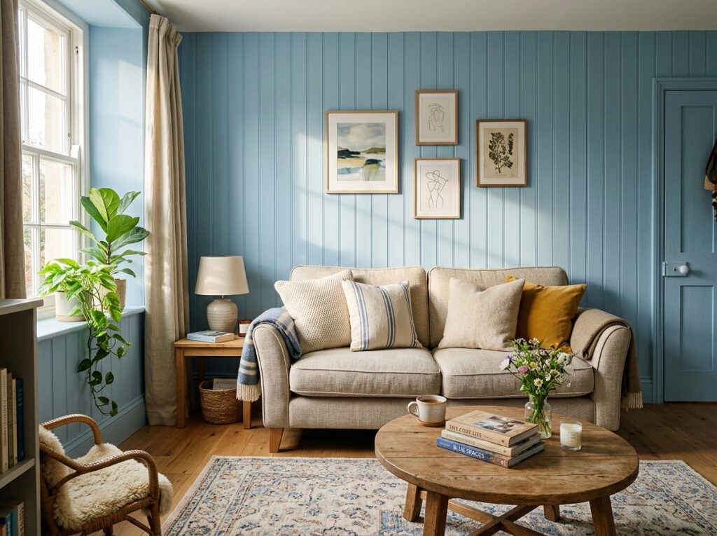 Use painter’s tape to map out evenly spaced panels and paint in a soft tone like muted blue or sage. Keep furniture simple to let the panel design stand out.