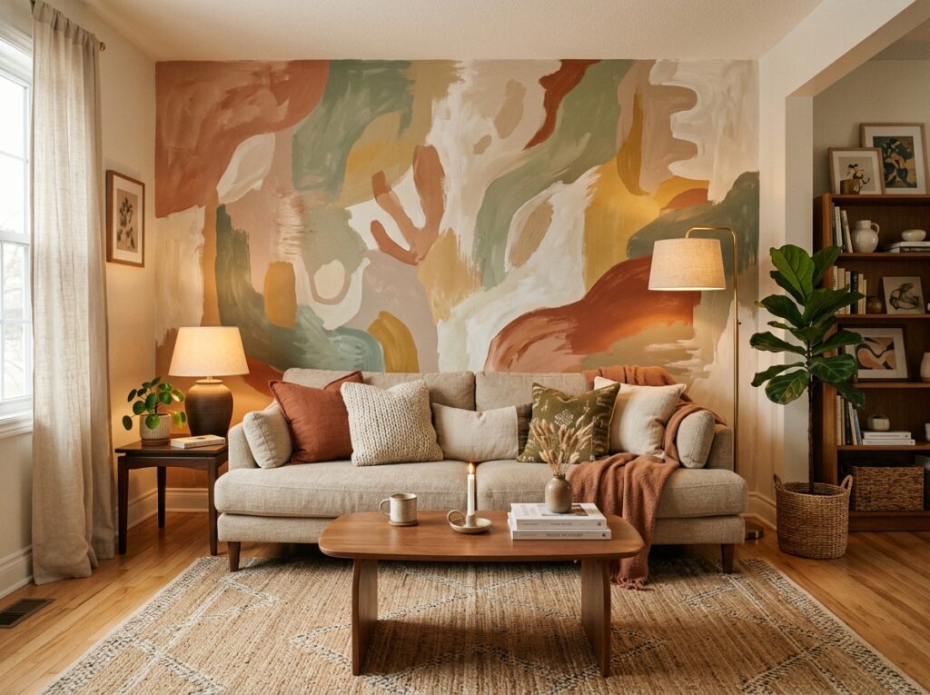 An abstract painted wall brings creativity and personality into your living room. The soft, imperfect shapes feel artistic and relaxed, adding a unique focal point.
