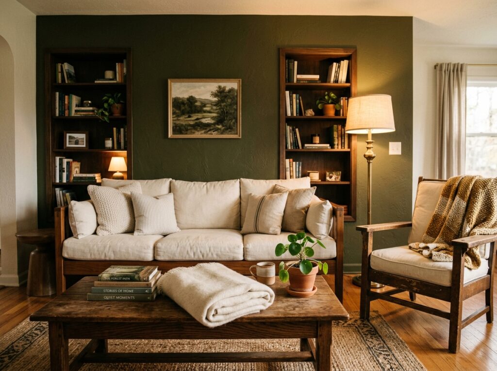Olive green creates a rich yet natural atmosphere that feels both cozy and grounded. It pairs beautifully with wood tones and soft textiles, making the room feel warm and inviting.