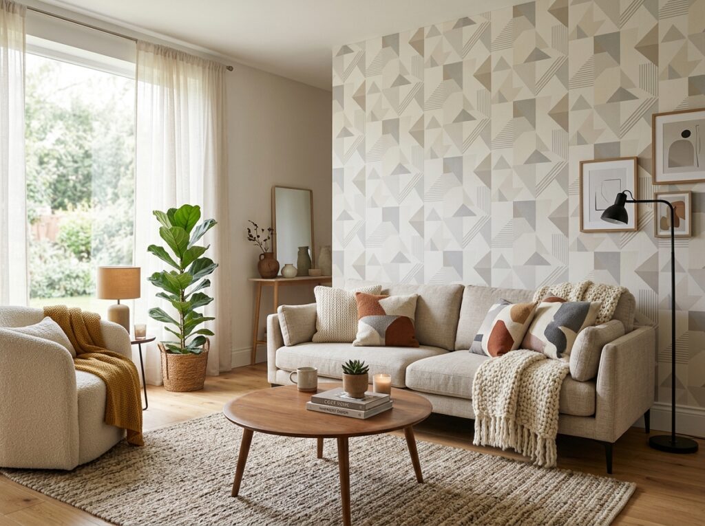 Geometric wallpaper adds structure and rhythm to your space, giving it a modern and slightly playful edge. It works especially well in contemporary living rooms.