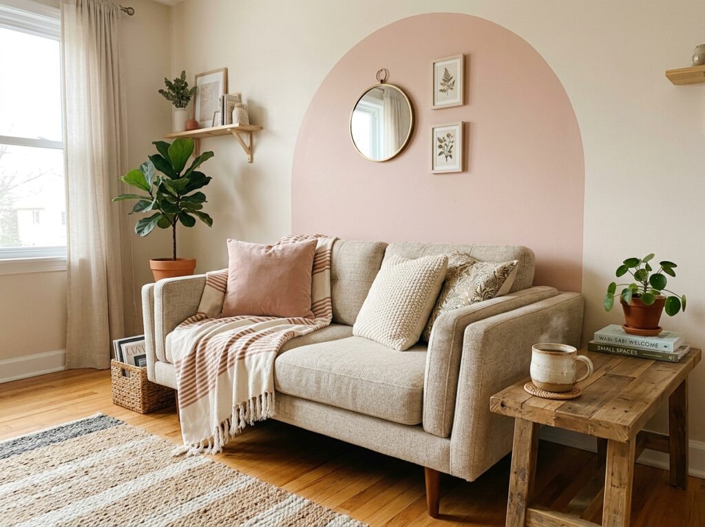 Paint an arch behind your sofa or console table using soft tones like blush or sage. Keep the rest of the wall neutral for balance.