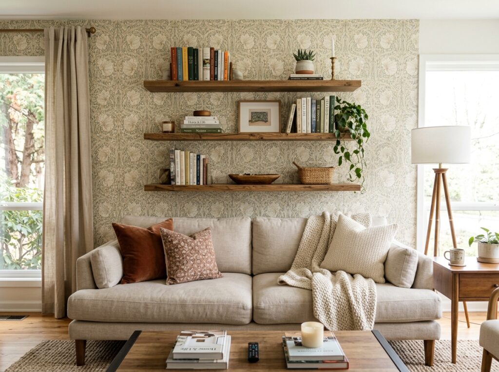 Wallpaper behind shelves creates depth and makes your decor stand out more. It adds a subtle layer of interest without taking over the room.