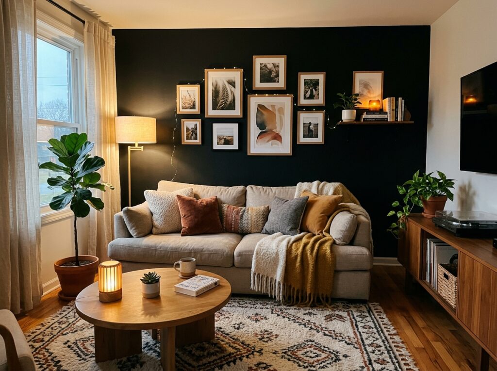 A black accent wall creates strong contrast and a sophisticated mood. When styled correctly, it still feels cozy rather than heavy.