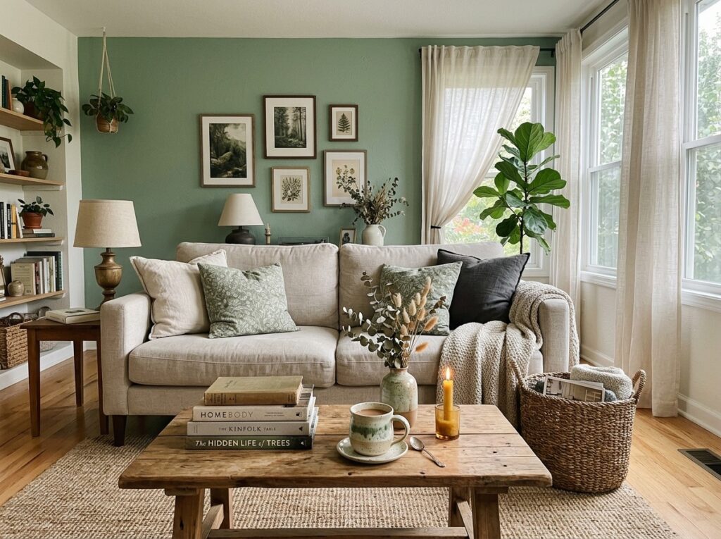 To recreate this look, choose a muted sage tone instead of a bright green. Pair it with neutral furniture like a linen sofa, then layer in wooden accents, woven baskets, and soft textiles for a cohesive, nature-inspired feel.