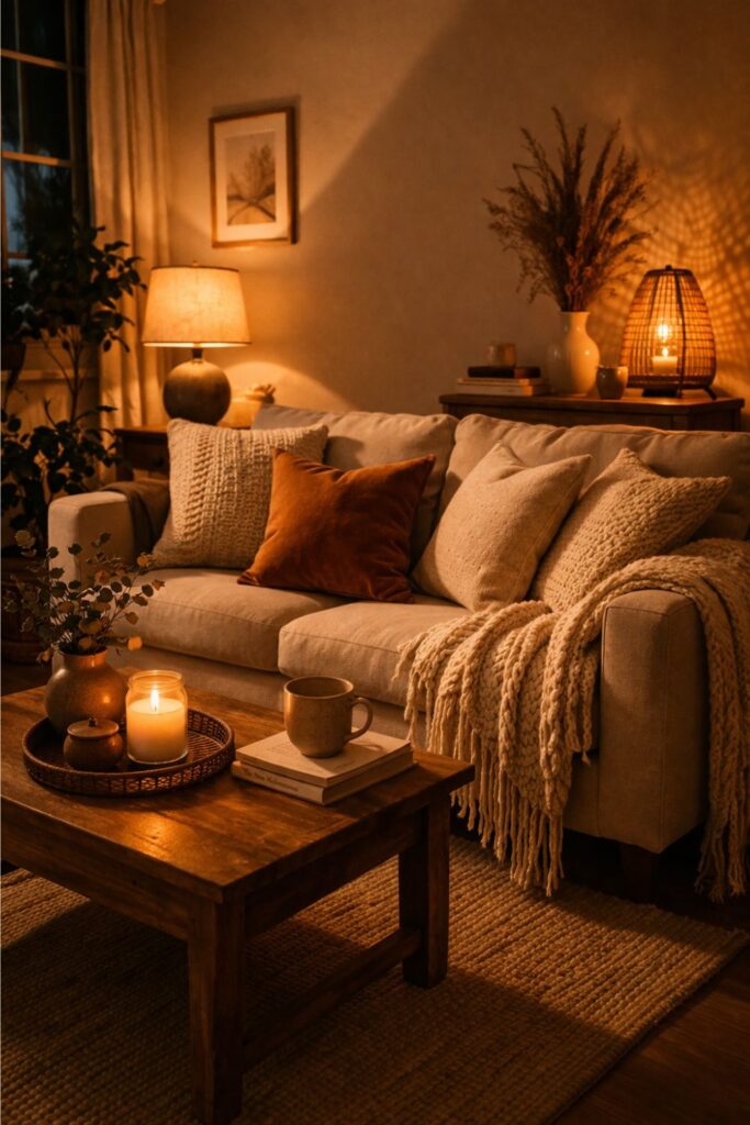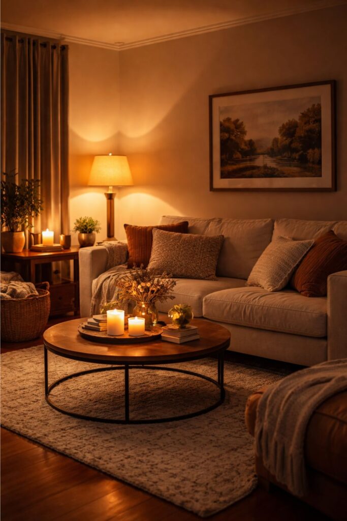 Use table lamps, floor lamps, and warm LED bulbs instead of harsh overhead lighting for a layered glow.