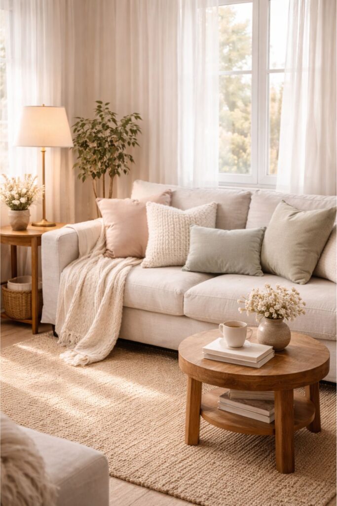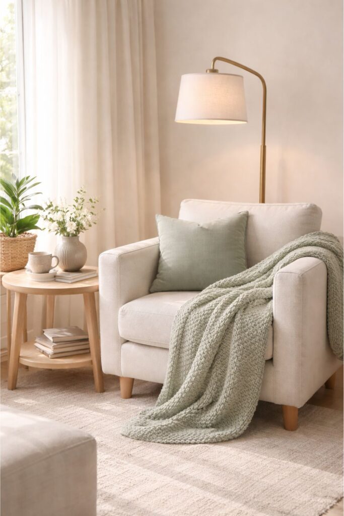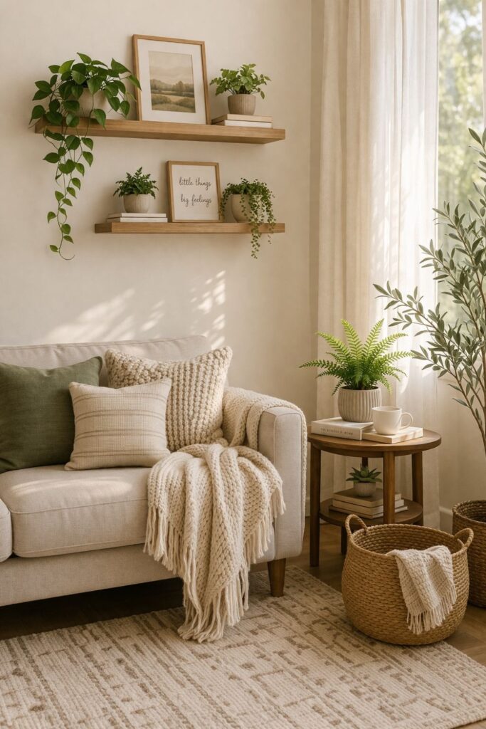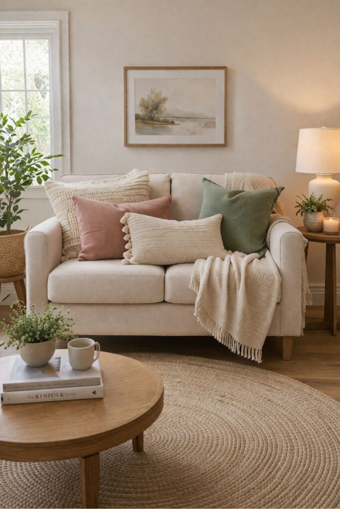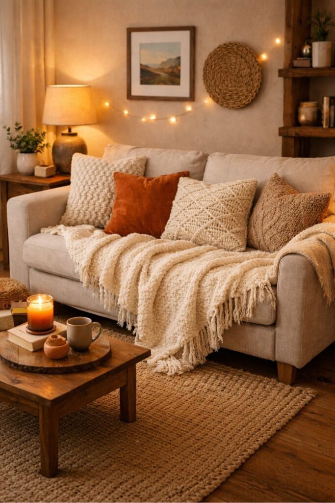 Start with a neutral base, then layer textures like knit blankets, boucle pillows, and woven baskets. Keep colors soft and cohesive for a calm, spacious feel.