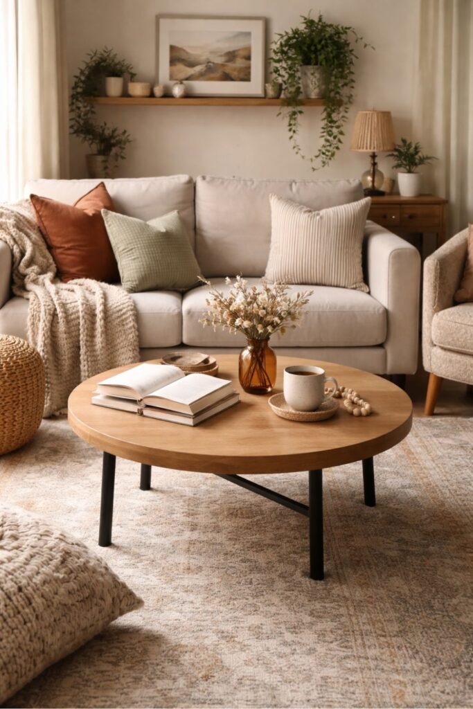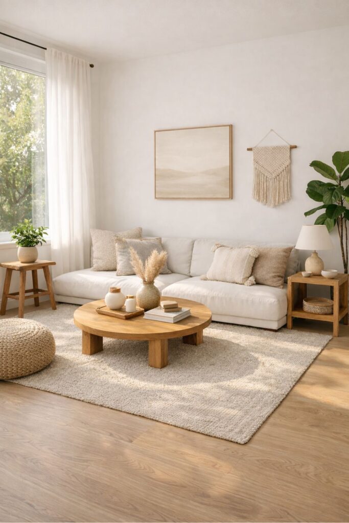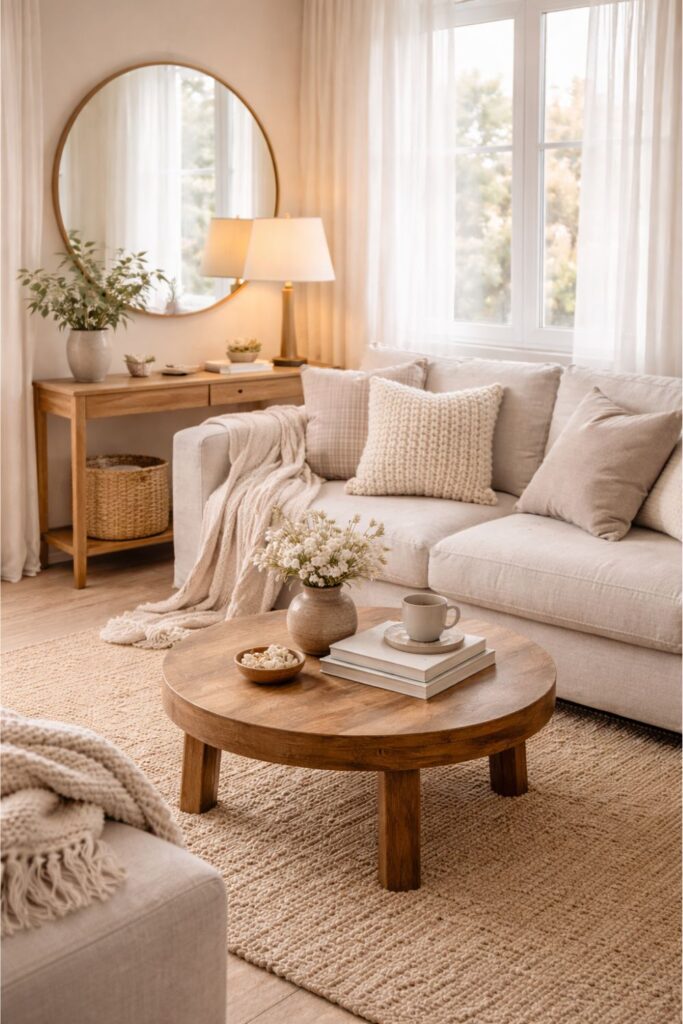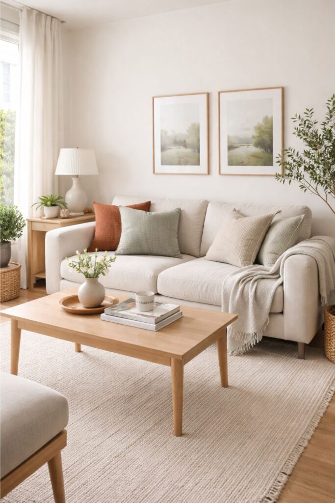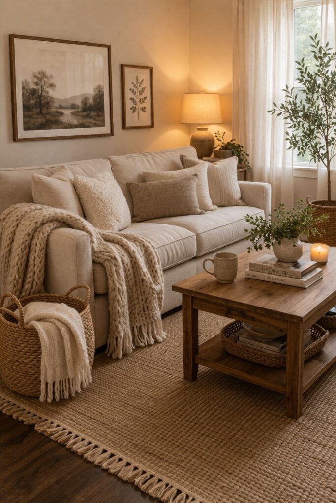 Start with a neutral base, then layer textures like knit blankets, boucle pillows, and woven baskets. Keep colors soft and cohesive for a calm, spacious feel.