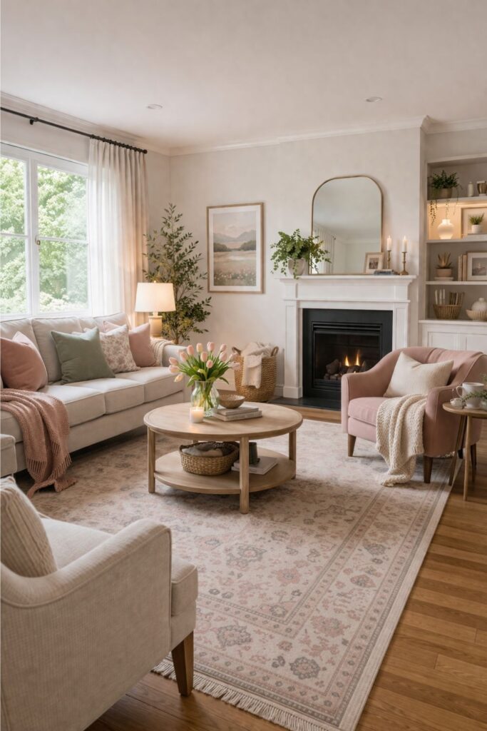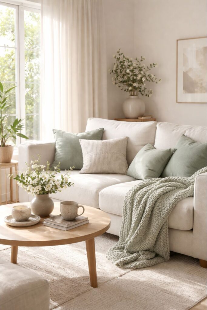 Stick to whites, creams, and light grays, then layer in accents like sage green or dusty rose through pillows and decor.