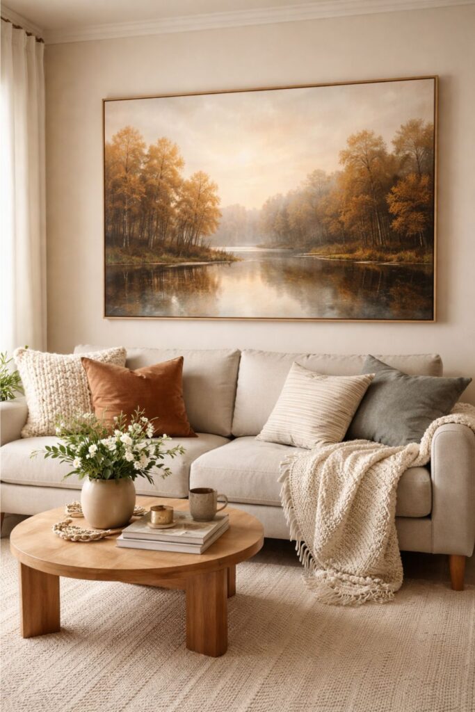 Large-scale artwork draws the eye upward, making the room feel bigger and more styled.