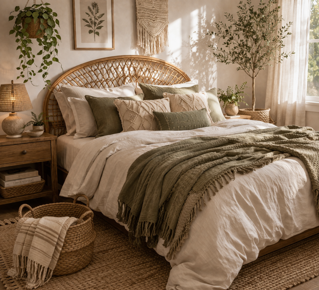 Incorporate rattan chairs, headboards, or baskets for a natural touch.