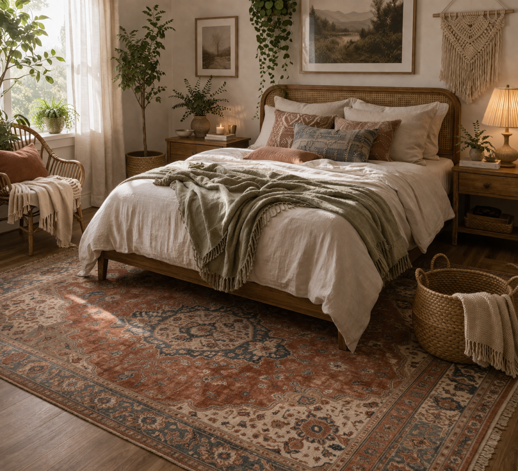 A vintage-style rug adds personality and anchors the room. Subtle patterns make the space feel curated and cozy.