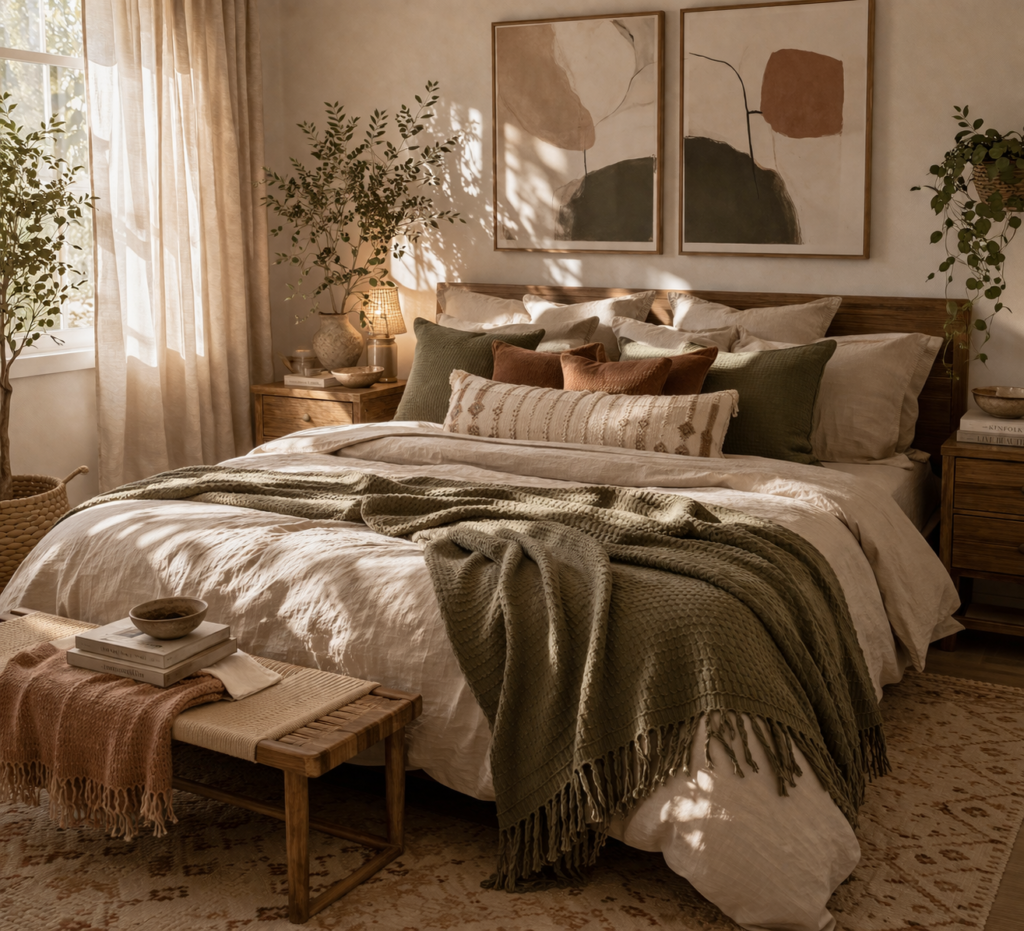 Soft, layered fabrics instantly make a bedroom feel warm and inviting. Think chunky knit throws, linen bedding, and textured cushions in soft earthy tones like sage, terracotta, and dusty rose. The space feels relaxed, tactile, and effortlessly cozy.
