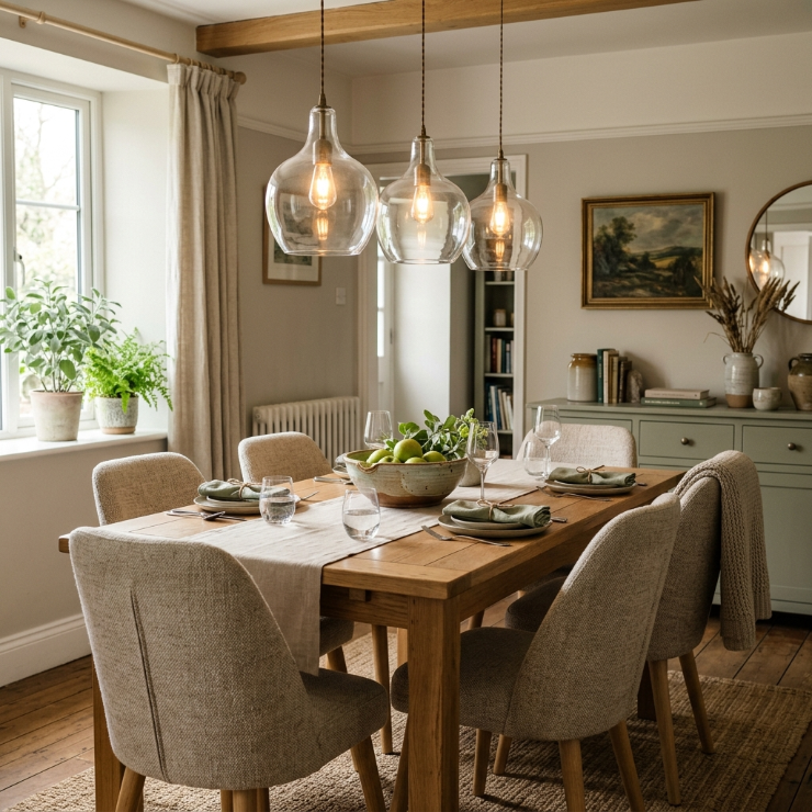 Glass lighting keeps the room feeling light and open while still adding elegance. It reflects light beautifully, making smaller dining rooms feel brighter and more spacious.