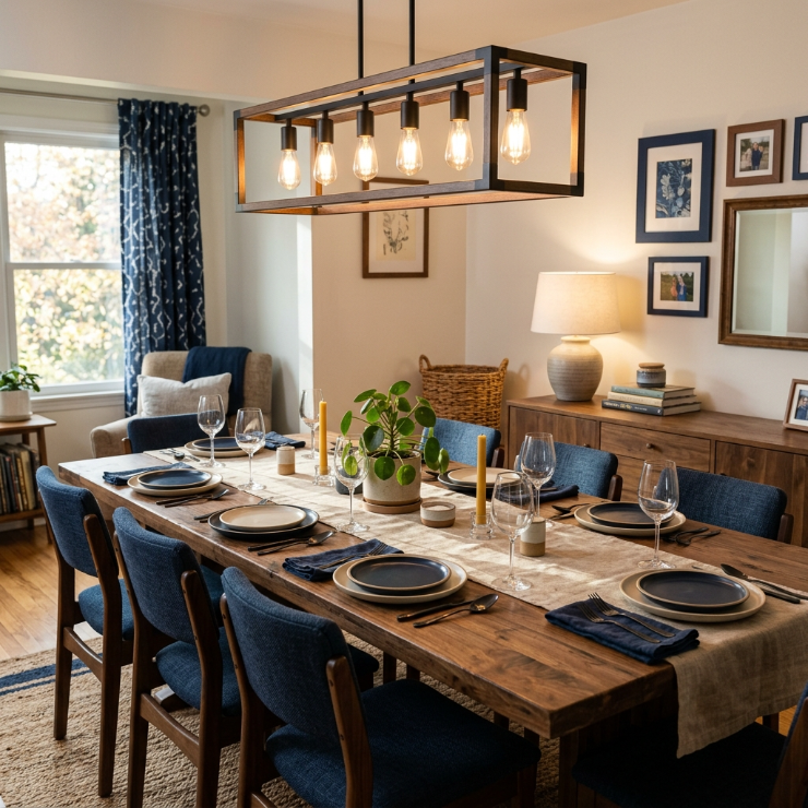 Choose a pendant that complements your table shape—round for circular tables, linear for long ones. Hang it about 30–36 inches above the table for the perfect balance of style and function.