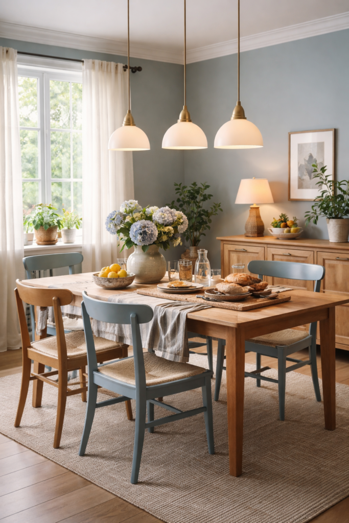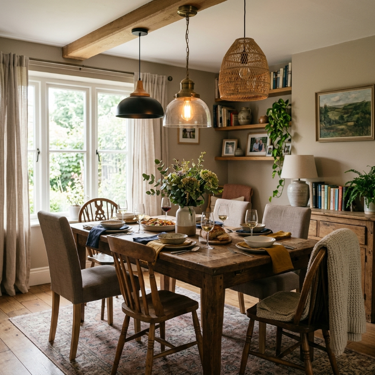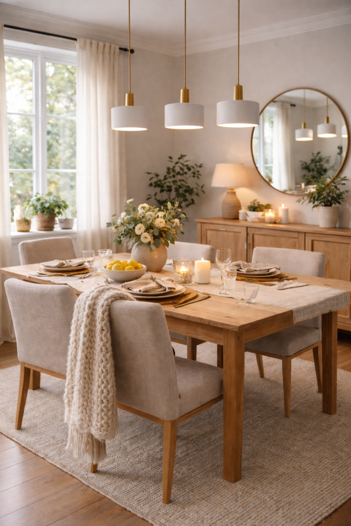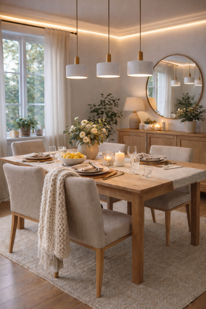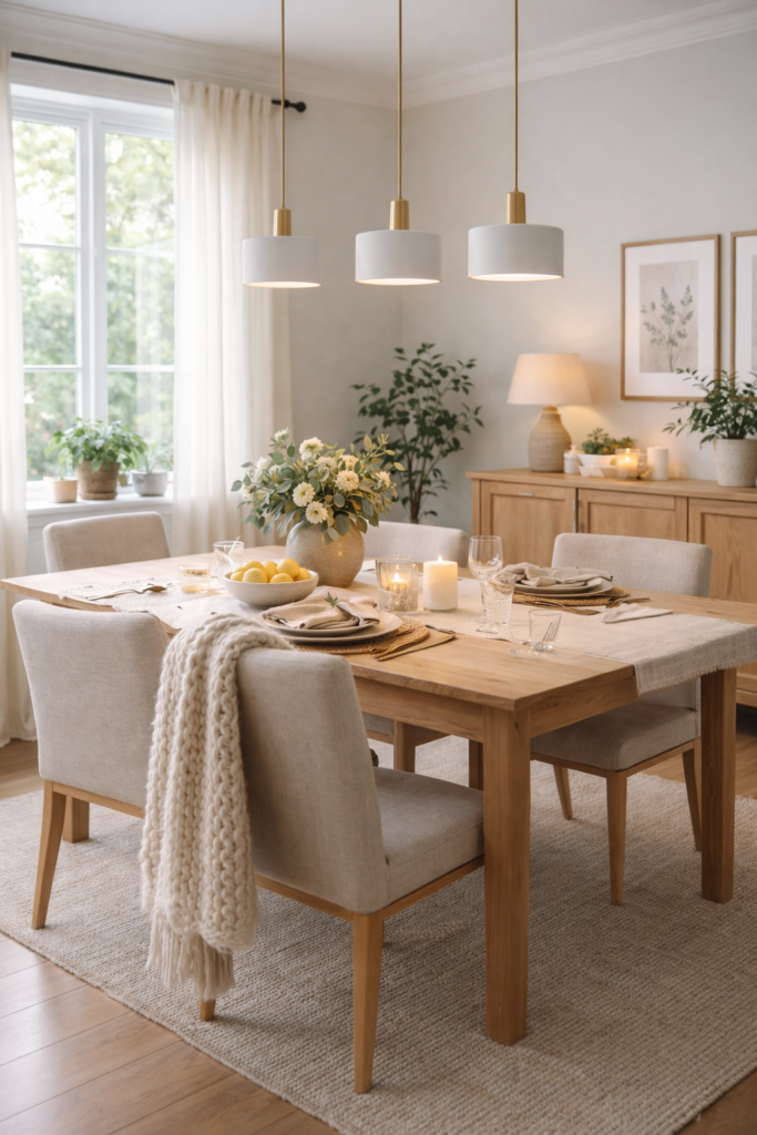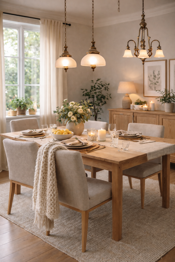 Using multiple pendants creates symmetry and ensures even lighting across the table. It feels modern and polished while still cozy.