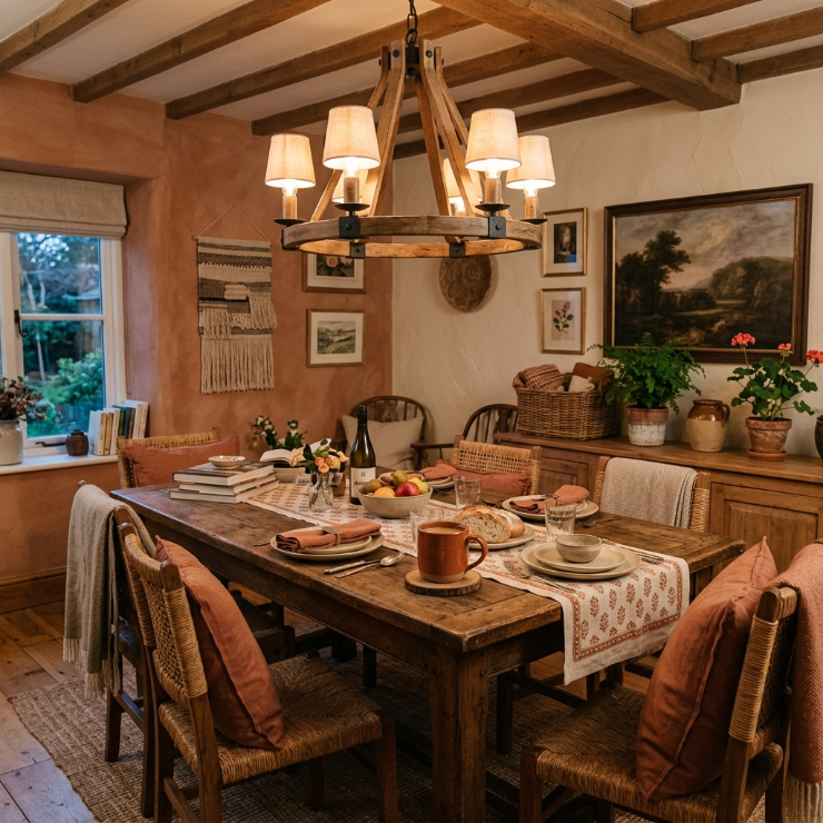Wooden chandeliers bring an organic, grounded feel to the dining room. They add warmth and texture, making the space feel cozy and relaxed rather than overly polished.