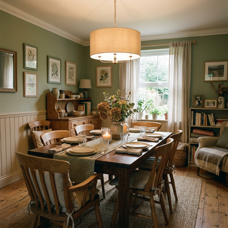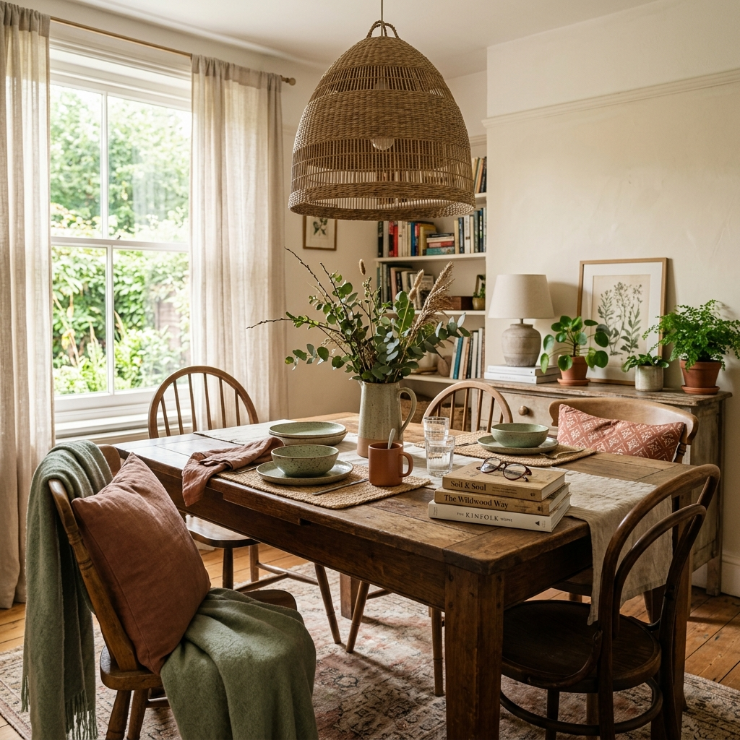 A bold pendant light hanging over the dining table instantly draws the eye and sets the tone for the entire space. It creates a cozy focal point while softly illuminating the table, making meals feel more intimate and inviting. The glow adds depth, especially when paired with textured furniture and warm tones.