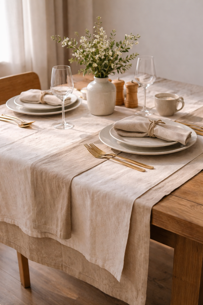 Layered linen runners and napkins bring an effortless softness that instantly elevates your dining table. The gentle wrinkles and natural texture create a relaxed yet refined look that feels warm and inviting.