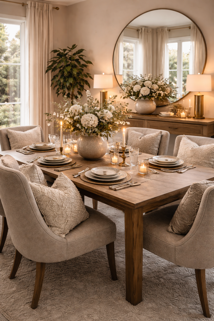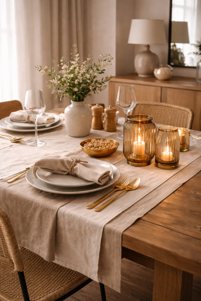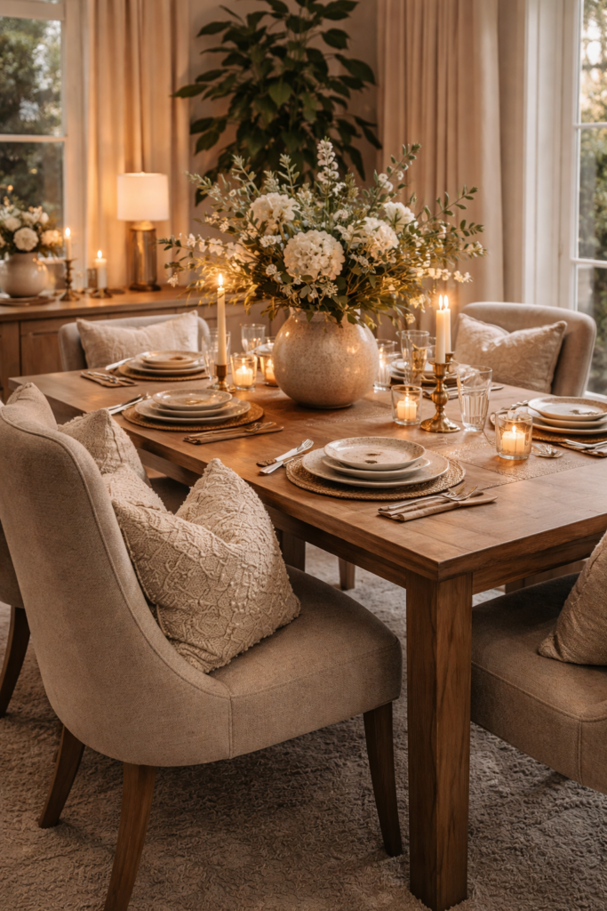 A simple, well-chosen centerpiece can feel more luxurious than an overcrowded table. Clean styling creates calm and sophistication.
