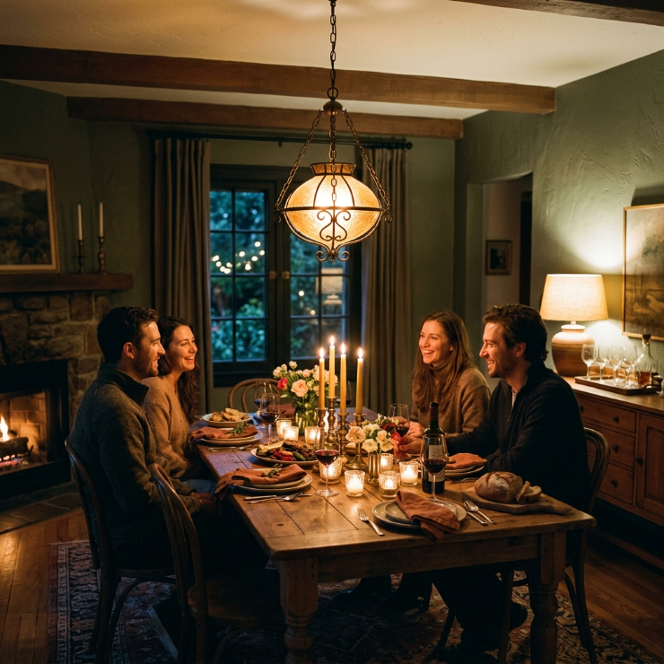 A beautiful chandelier or pendant light instantly transforms your dining space into something that feels elevated and intentional. The soft glow reflecting off metal or glass creates a warm, ambient atmosphere that feels calm, intimate, and quietly luxurious.