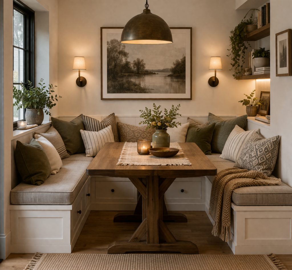 Built-in benches maximize seating without taking up extra space. They create a cozy, tucked-in feel.