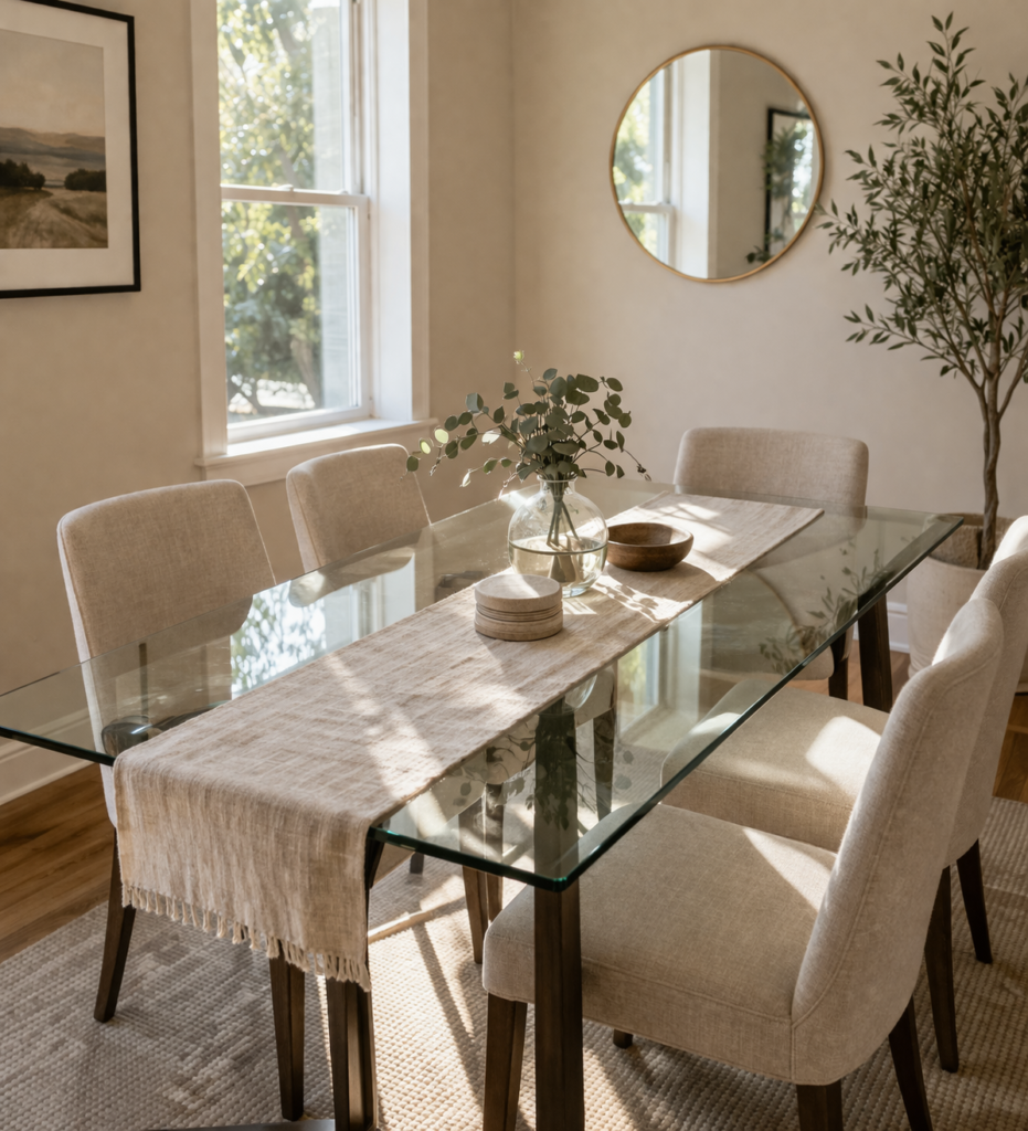 Pair a glass table with simple chairs and soft accents to keep the space warm and inviting.