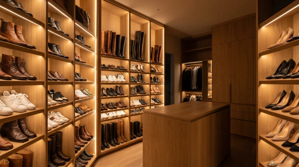 Stacked shoe storage clears the floor and adds structure. It makes the closet feel more open.